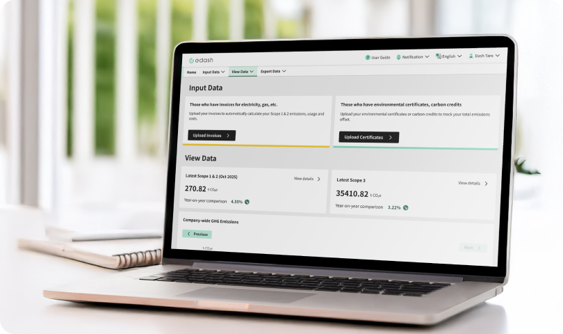 Our product lineup includes the e-dash SaaS platform for GHG emissions management, the e-dash Survey for ESG data, the e-dash Carbon Offset marketplace, and the e-dash CFP for calculating and managing product-level carbon footprints (Carbon Footprint of Products, CFP). Beyond technology, our consulting team works closely with clients to deliver integrated solutions.